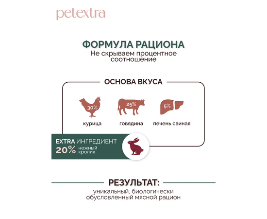 PETEXTRA - это качественное питание, которое полностью удовлетворит потребности вашего любимца. Изготовлен из 100% натуральных ингредиентов, включая мясо, субпродукты, витамины и микроэлементы, он предлагает полный комплекс питательных веществ для поддержания здоровья и благополучия вашего кота.