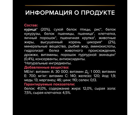 | Состав | Курица* (20%), сухой белок птицы, рис*, белок кукурузы, белок пшеницы, пшеница*, клетчатка, яичный порошок*, пшеничная крупка*, животные жиры, высушенный корень цикория* (2%), минеральные вещества, рыбий жир, аминокислоты, гидролизат белка животного происхождения, дрожжи, витамины, порошок пурпурной эхинацеи* (0.4%), консерванты, антиоксиданты. *Натуральные ингредиенты. Информация о составе на сайте является справочной. Вся информация о продукте представлена непосредственно на упаковке. |