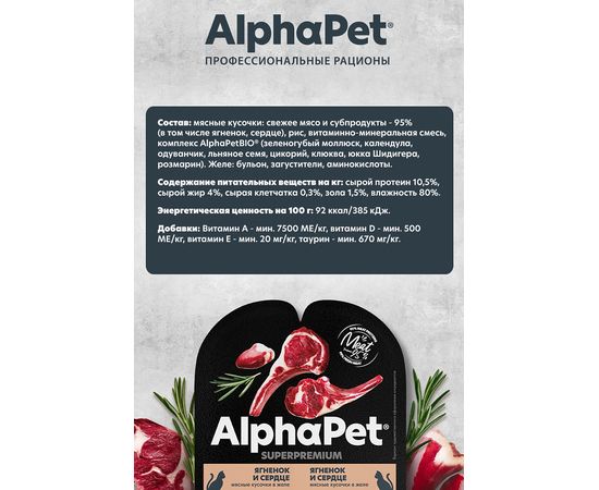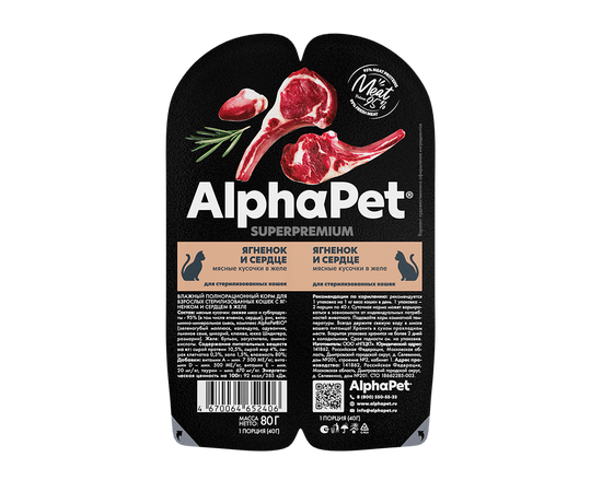 Влажный корм AlphaPet Superpremium для стерилизованных кошек, ягненок и сердце кусочки в желе, 80г