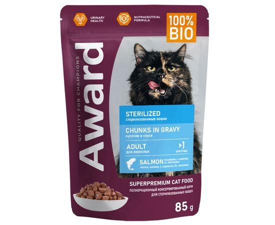 Влажный корм Award Sterilized для взрослых стерилизованных кошек, кусочки в соусе с лососем, 85г