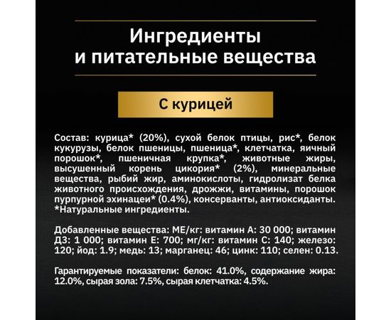 Курица* (20%), сухой белок птицы, рис*, белок кукурузы, белок пшеницы, пшеница*, клетчатка, яичный порошок*, пшеничная крупа*, животные жиры, высушенный корень цикория* (2%), минеральные вещества, рыбий жир, аминокислоты, гидролизат белка животного происхождения, дрожжи, витамины, порошок пурпурной эхинацеи* (0.4%), консерванты, антиоксиданты.