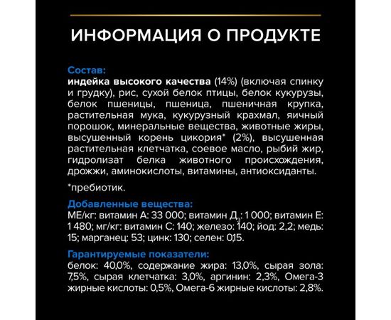 Состав: индейка (14%), сухой белок птицы, рис, кукурузный глютен, пшеничный глютен, пшеница, волокна пшеницы, соевая мука, кукурузный крахмал, яичный порошок, животный жир, высушенный корень цикория, соевое масло, клетчатка, минеральные вещества, витамины, рыбий жир, аминокислоты, вкусоароматическая кормовая добавка, дрожжи.
