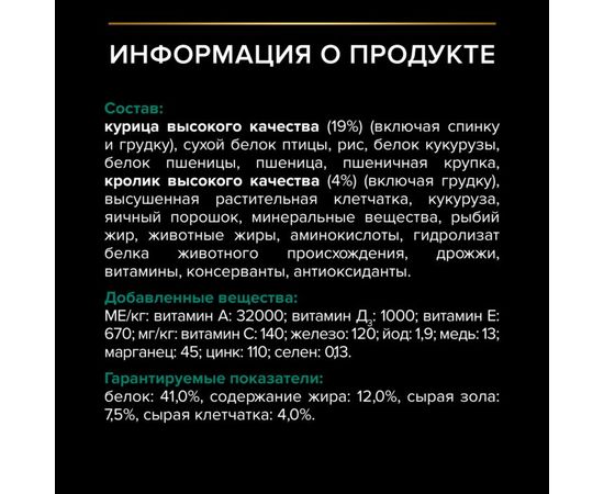 Состав: курица, сухой белок птицы, рис, кукурузный глютен, пшеничный глютен, пшеница, волокна пшеницы, кролик (4%), клетчатка, кукуруза, яичный порошок, минеральные вещества, рыбий жир, животный жир, консерванты, вкусоароматическая кормовая добавка, дрожжи, витамины, аминокислоты.