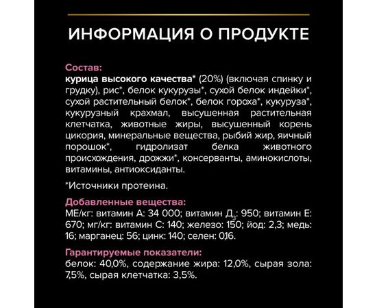 Курица (20%), сухой белок птицы, кукурузный глютен, рис, пшеничный глютен, волокна пшеницы, пшеница, клетчатка, кукуруза, яичный порошок, высушенный корень цикория (2%*), минеральные вещества, рыбий жир, животный жир, консерванты, вкусоароматическая кормовая добавка, дрожжи, витамины, аминокислоты.