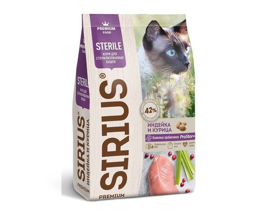 SIRIUS — сухой корм премиум класса для полноценного ежедневного рациона стерилизованных кошек. Высокое содержание мясных ингредиентов обеспечивает оптимальный уровень белка и укрепляет мышцы. Пониженное содержание жиров для контроля веса. Баланс витаминов и комплекса пробиотиков 4-го поколения PROSTOR+ нормализует пищеварение и укрепляет иммунитет. Омега 3 и Омега 6 способствуют поддержанию здоровья сердца, мозга, нервной системы, здоровья кожи и красоты шерсти. Корм способствует профилактике мочекаменной болезни.