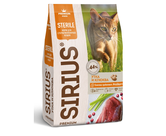 SIRIUS — сухой корм премиум класса для полноценного ежедневного рациона стерилизованных кошек. Высокое содержание мясных ингредиентов обеспечивает оптимальный уровень белка и укрепляет мышцы. Пониженное содержание жиров для контроля веса. Баланс витаминов и комплекса пробиотиков 4-го поколения PROSTOR+ нормализует пищеварение и укрепляет иммунитет. Омега 3 и Омега 6 способствуют поддержанию здоровья сердца, мозга, нервной системы, здоровья кожи и красоты шерсти. Корм способствует профилактике мочекаменной болезни.
