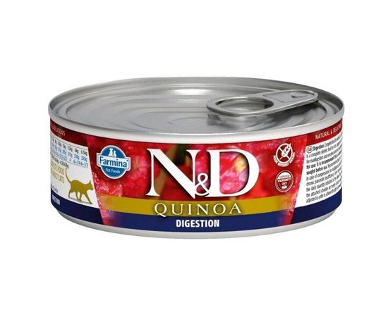 N&D Quinoa Digestion - диетический полнорационный влажный корм для кошек, рекомендуемый при нарушениях переваривания пищи и при экзокринной недостаточности поджелудочной железы.