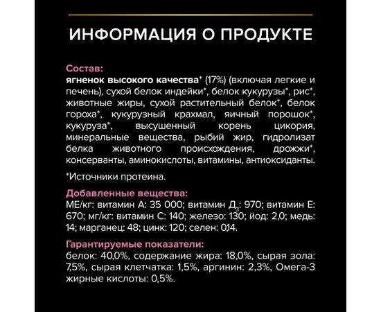 Ягненок (17%), куриная мука, рис, кукурузный глютен, концентрат белка гороха, животный жир, кукуруза, кукурузный крахмал, яичный порошок, минеральные вещества, аминокислоты, рыбий жир, вкусоароматическая кормовая добавка, дрожжи, консерванты, витамины, антиоксиданты.