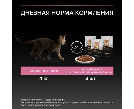 Для взрослой кошки среднего веса (4 кг) требуется 3 пакетика в день, разделенных на два кормления. Следите, что бы у Вашей кошки была всегда чистая, свежая питьевая вода