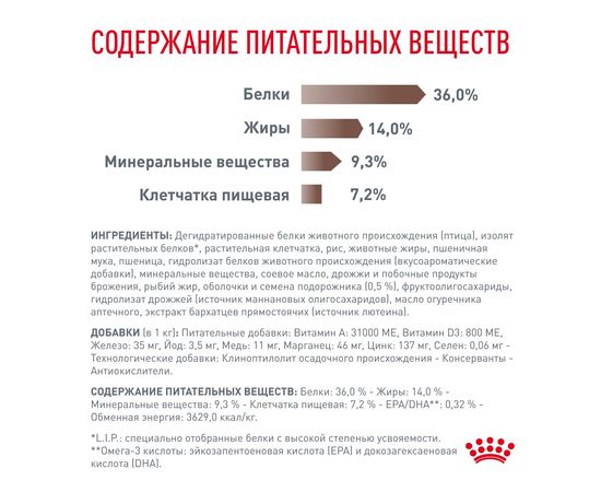 Способствует выведению проглоченной шерсти и снижению риска образования волосяных комочков, помогает поддерживать здоровое пищеварение и оптимальное качество стула. Умеренное содержание энергии в диете помогает контролировать массу тела.