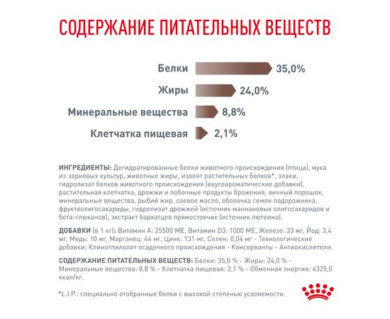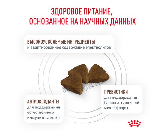 Преимущества: -Поддержание здоровья пищеварительной системы: Высокоусвояемая формула, содержащая сбалансированный комплекс разных видов клетчатки, в том числе пребиотики, способствует поддержанию здорового пищеваренияи оптимального качества стула. -Оптимальный рост:Формула с высоким содержанием энергии и адаптированным уровнем питательных веществ (включая белок и кальций) удовлетворяет потребности растущих котят. -Легкое размачивание:Крокеты, которые легко размачивать, стимулируют потребление корма котятами с пониженным аппетитом и облегчают переход с молока на твердый корм.