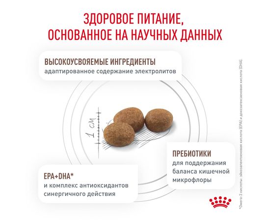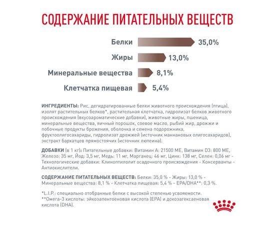 • Легкоусвояемые ингредиенты. • Повышенное содержание электролитов. • Пониженный уровень жиров. • Высокоусвояемая диета с умеренным содержанием жира помогает контролировать массу тела у кастрированных или склонных к избыточному весу животных. • Способствует поддержанию здорового пищеварения и оптимального качества стула.