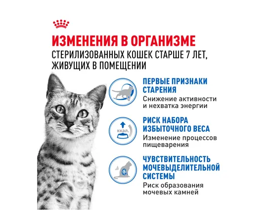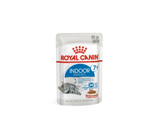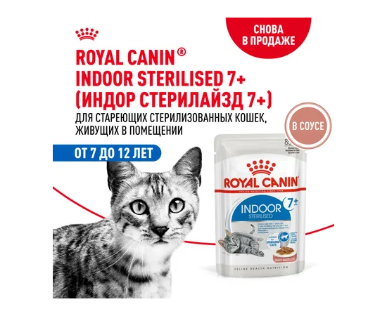 Корм консервированный полнорационный для кошек (в возрасте от 7 до 12 лет), живущих в помещении INDOOR STERILISED 7+ (ИНДОР СТЕРИЛАЙЗД 7+), мелкие кусочки в соусе ROYAL CANIN®, подходящий для взрослых кастрированных и стерилизованных кошек, живущих в помещении , специально разработан с учетом потребностей вашей кошки в питательных веществах.
