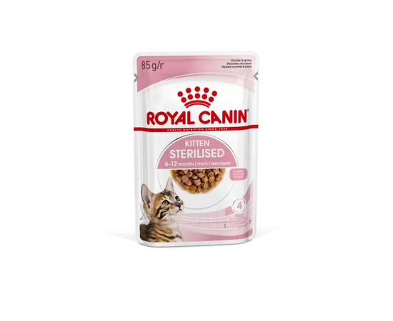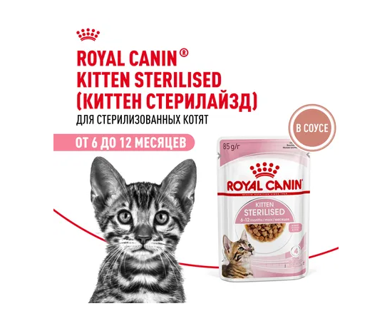 Корм консервированный полнорационный для кошек – Специально для кастрированных и стерилизованных котят (в возрасте от 6 до 12 месяцев) KITTEN STERILISED (КИТТЕН СТЕРИЛАЙЗД), мелкие кусочки в соусе ROYAL CANIN®.