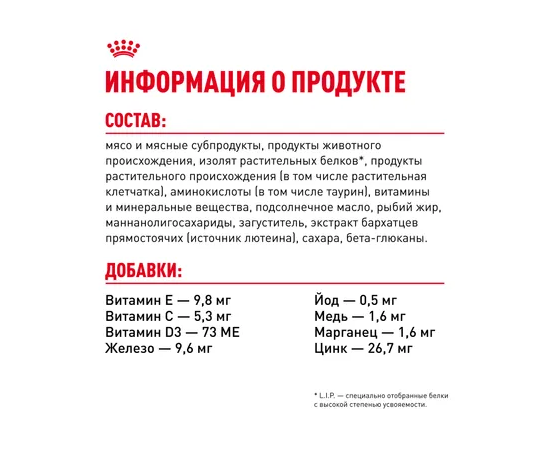 ИНГРЕДИЕНТЫ: мясо и мясные субпродукты, продукты животного происхождения, изолят растительных белков*, продукты растительного происхождения (в том числе растительная клетчатка), аминокислоты (в том числе таурин), витамины и минеральные вещества, подсолнечное масло, рыбий жир, маннанолигосахариды, загуститель, экстракт бархатцев прямостоячих (источник лютеина), сахара, бета-глюканы.