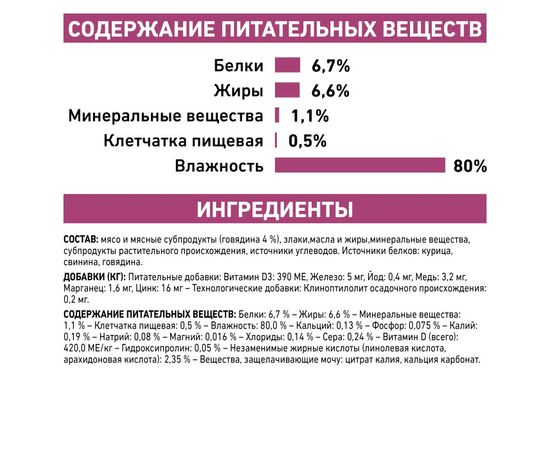 СОДЕРЖАНИЕ ПИТАТЕЛЬНЫХ ВЕЩЕСТВ: Белки:6,7 % -Жиры: 6,6 % -Минеральные вещества: 1,1 % -Клетчатка пищевая: 0,5 % -Влажность: 80,0 % -Кальций: 0,13 % -Фосфор: 0,075 % -Калий: 0,19 % -Натрий: 0,08 % -Магний: 0,016 % -Хлориды: 0,14 % -Сера: 0,24 % -Витамин D (всего): 420,0 ME/кг -Гидроксипролин: 0,05 % -Незаменимые жирные кислоты (линолевая кислота, арахидоновая кислота): 2,35 % -Вещества, защелачивающие мочу:цитрат калия,кальция карбонат.