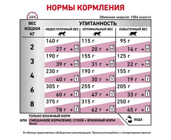 Длительность курса применения: Минимальный срок назначения диетотерапии составляет 6 месяцев. По истечении этого времени необходимо повторное общее обследование. Если повреждены 3/4 нефронов почек, болезнь приобретает необратимый характер, и диетотерапию назначают для применения в течение всей жизни кошки.