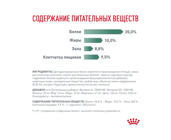 СОДЕРЖАНИЕ ПИТАТЕЛЬНЫХ ВЕЩЕСТВ: на 100 г корма Белки 34 г, Жиры 9 г, Углеводы 19,1 г, БЭВ 28,8 г, Клетчатка пищевая 14,6 г