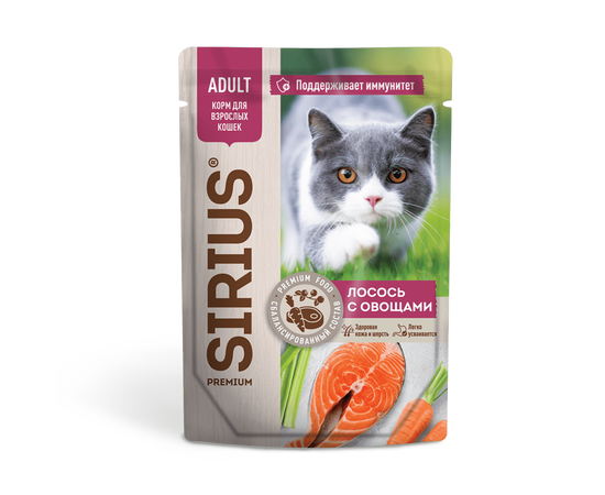 Влажный корм Sirius для взрослых кошек, лосось с овощами, 85 г