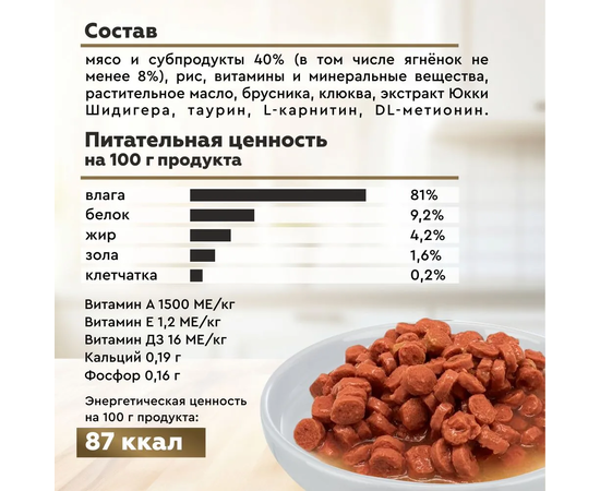 мясо и субпродукты 40% (в том числе ягнёнок не менее 8%), рис, витамины и минеральные вещества, растительное масло, брусника, клюква, экстракт Юкки Шидигера, таурин, L-карнитин, DL-метионин. Питательная ценность в 100 г продукта: белок - 9,2%, жир - 4,2%, влага - 81%,