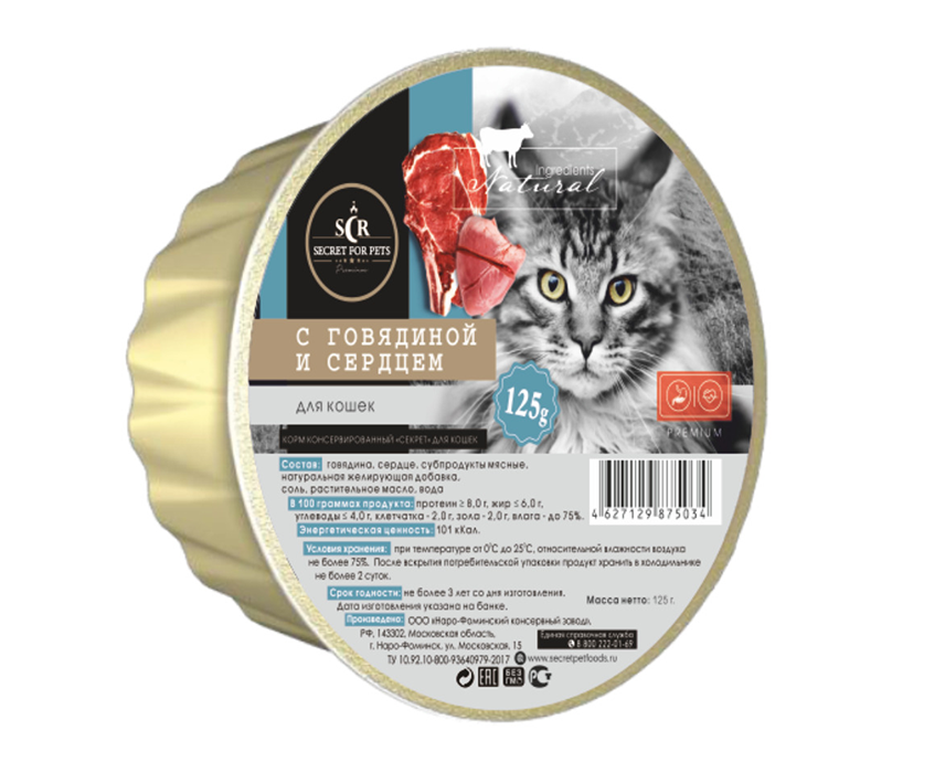 Секрет Премиум консервы для кошек - Паштет с говядиной и сердцем, 125г (ламистр)