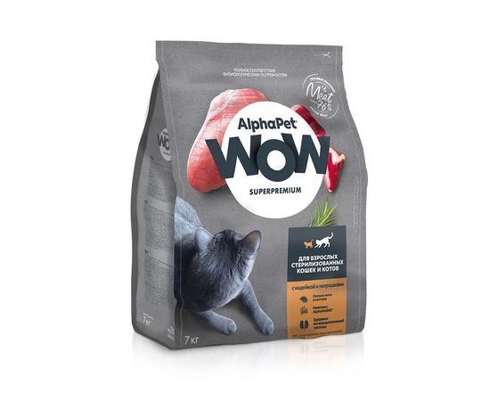 AlphaPet WOW для стерилизованных взрослых кошек с индейкой и потрошками сухой 7кг, 652086