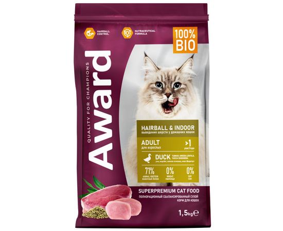 Сухой корм Award Hairball & Indoor для взрослых кошек для выведения шерсти, с уткой и зеленой чечевицей, 1.5кг