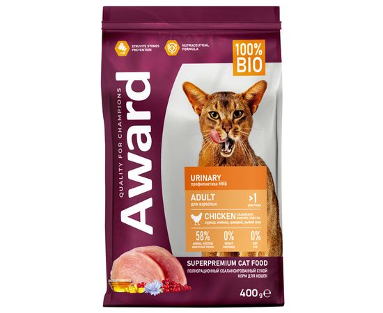 Сухой корм Award Urinary для взрослых кошек для профилактики МКБ, с курицей, клюквой, цикорием и рыбьим жиром, 400г
