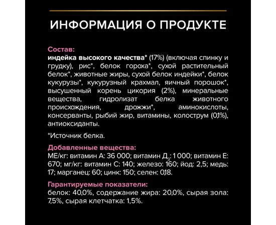 Состав: индейка (17%**), рис**, сухой белок индейки**, концентрат белка гороха**, животный жир, соевый белок**, кукурузный глютен**, кукурузный крахмал, высушенный корень цикория (2%*), минеральные вещества, вкусоароматическая кормовая добавка, дрожжи**, аминокислоты, витамины, рыбий жир, консерванты, антиоксиданты.