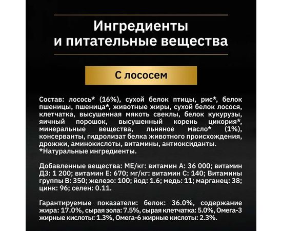 Лосось* (17%), сухой белок птицы, рис*, пшеница*, белок кукурузы, белок пшеницы, животные жиры, сухой белок лосося, высушенная мякоть свеклы, клетчатка, яичный порошок, высушенный корень цикория*, минеральные вещества, льняное масло* (1%), гидролизат белка животного происхождения, дрожжи, консерванты, аминокислоты, витамины, антиоксиданты.