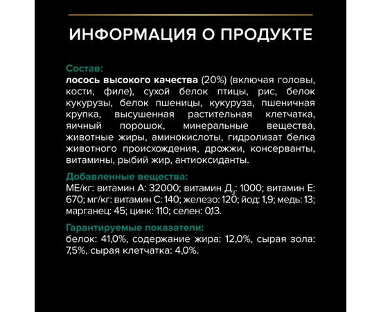 Состав: лосось (20%), сухой белок птицы, рис, кукурузный глютен, кукуруза, пшеничный глютен, волокна пшеницы, клетчатка, яичный порошок, минеральные вещества, животный жир, аминокислоты, вкусоароматическая кормовая добавка, дрожжи, консерванты, витамины, рыбий жир, антиоксиданты.