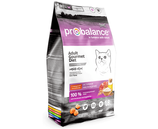Считается, что кошки избирательны в еде. Датские ученые по кормлению животных выявили любопытный факт. Выбирая пищу, привередливые кошки ищут еду с особым соотношением питательных веществ. На основе этих наблюдений разработан корм Probalance "Gourmet Diet Beef & Lamb" (Пробаланс "Гурме Дайет Эдалт Биф энд Ламб"). Корм имеет 100% натуральный состав. В основу положено 2 вида мяса – ягненок и говядина (25% мяса). В перечне компонентов нет курицы, поэтому рацион Probalance "Gourmet Diet" подойдет питомцам с аллергией на этот вид мяса.