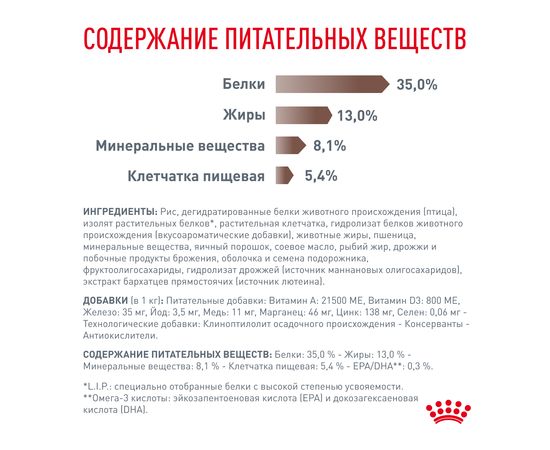 Рис, дегидратированный белок мяса птицы, пшеничная клейковина*, кукурузная клейковина, растительная клетчатка, гидролизат белков животного происхождения, животные жиры, минеральные вещества, соевое масло, свекольный жом, яичный порошок, рыбий жир, дрожжи, фруктоолигосахариды (ФОС), оболочка и семена подорожника, гидролизат дрожжей (источник маннановых олигосахаридов), экстракт бархатцев прямостоячих (источник лютеина).