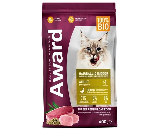Сухой корм Award Hairball & Indoor корм для взрослых кошек для выведения шерсти, с уткой и зеленой чечевицей, 10 кг