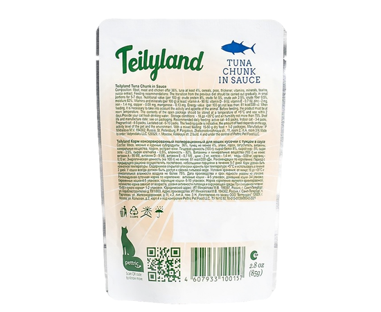 Pettric Teilyland влажный корм для кошек, кусочки с тунцом в соусе, 85 г