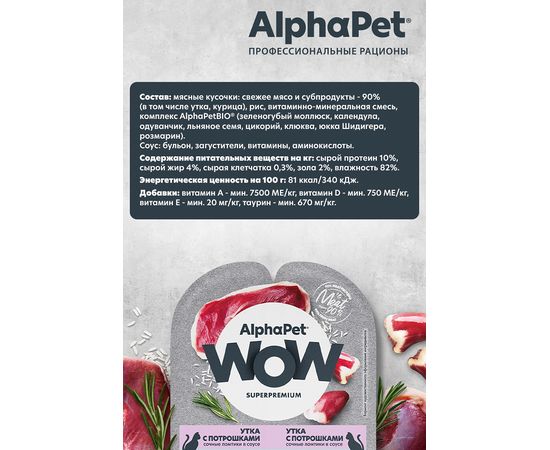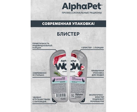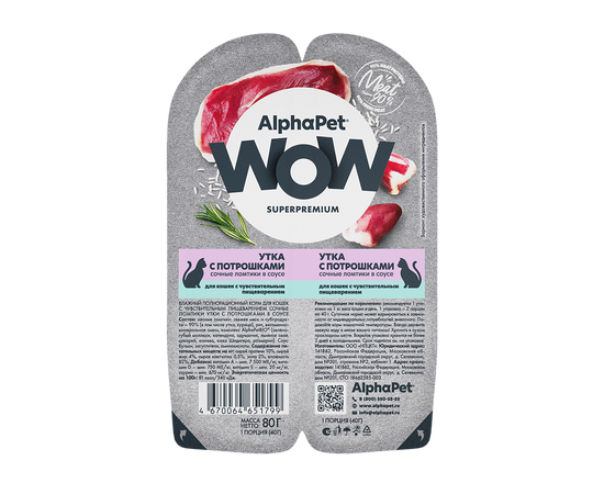 Влажный корм AlphaPet WOW для кошек с чувствительным пищеварением, утка с потрошками сочные ломтики в соусе, 80г