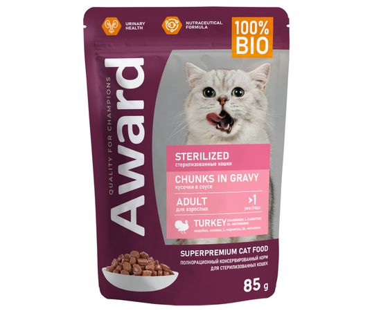 Влажный корм Award Sterilized для взрослых стерилизованных кошек, кусочки в соусе с индейкой, 85г