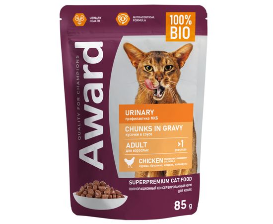 Влажный корм AWARD Urinary для взрослых кошек для профилактики МБК, кусочки с курицей, 85г