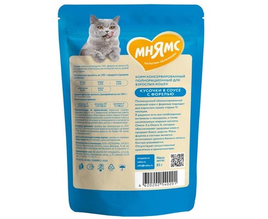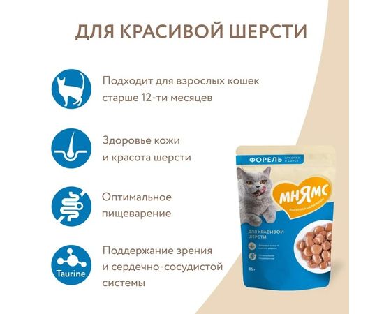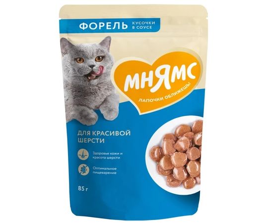 Мнямс влажный корм кусочки в соусе с форелью для красивой шерсти кошек, 85г,540201