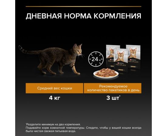 Для взрослой кошки среднего веса (4 кг) требуется 3 пакетика в день, разделенных минимум на 2 кормления. Индивидуальные потребности кошки могут варьироваться, и ежедневное количество корма должно быть скорректировано в соответствии с необходимостью поддержания оптимального веса кошки. Подавайте корм комнатной температуры. Следите, чтобы у вашей кошки всегда была чистая свежая питьевая вода.