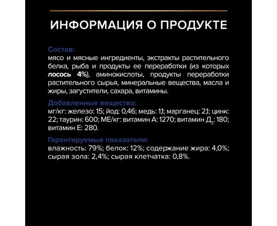 Состав: Мясо и продукты переработки мяса, экстракты растительных белков, рыба и продукты переработки рыбы (в том числе лосось 4%), растительные и животные жиры, минеральные вещества, красители, антиоксиданты, сахара, продукты переработки растительного сырья, витамины.