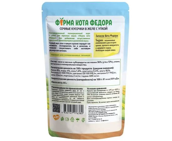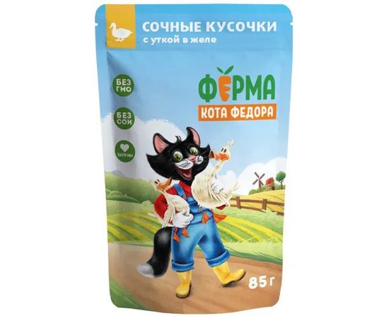 Влажный корм Ферма кота Фёдора сочные кусочки в желе для кошек с уткой 85г,7176380