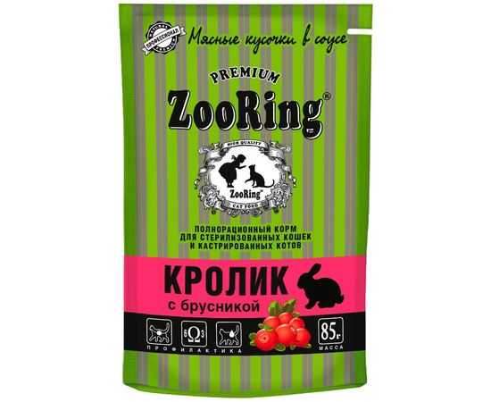 Корм ZooRing для стерилизованных кошек, кусочки в соусе кролик с брусникой, 85гр