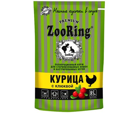 Корм ZooRing для стерилизованных кошек, кусочки в соусе курица с клюквой, 85гр