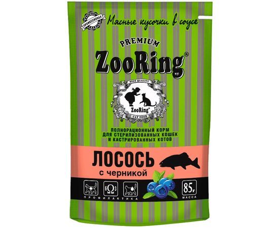 Влажный корм ZooRing для стерилизованных кошек, кусочки в соусе лосось с черникой, 85гр