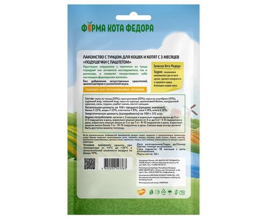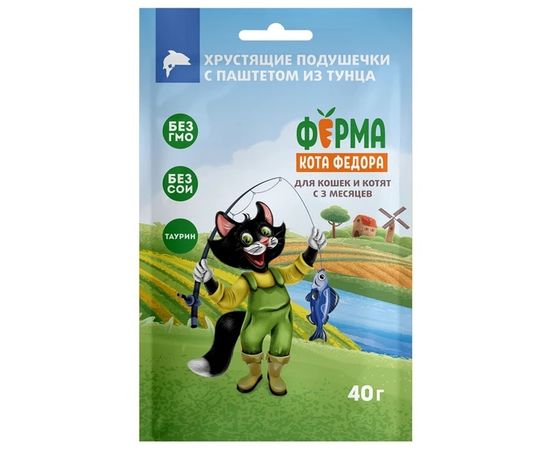 Лакомство Ферма кота Федора хрустящие подушечки для кошек и котят с паштетом из тунца 40 г