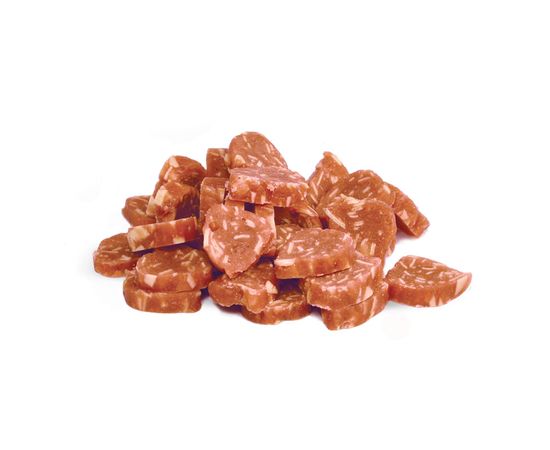 Состав: говядина - 59%, филе трески - 23%, кукурузный крахмал - 6.5%, арахисовый белок - 4%, сорбитол - 4%, глицерин - 3.5%.