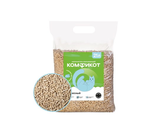 Наполнитель древесный КОМФИКОТ для кошачьего туалета, впитывающий, мелкие гранулы, 21 л