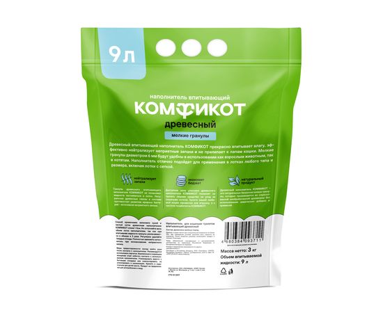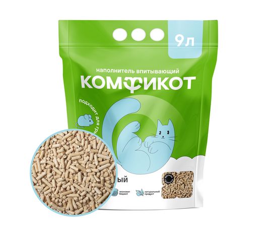 Наполнитель древесный КОМФИКОТ для кошачьего туалета, впитывающий, мелкие гранулы, 9 л