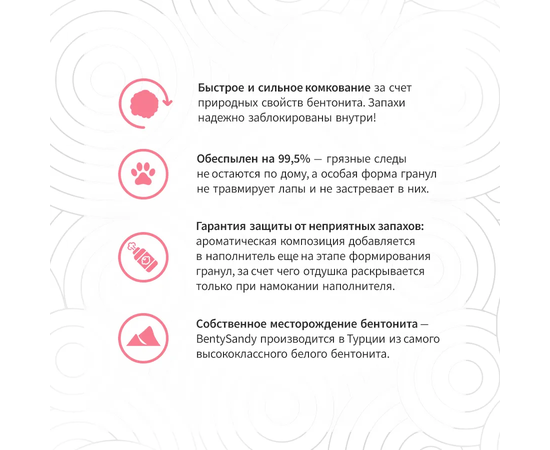 Гранулы наполнителя смешиваются с ароматизатором в ходе производства, а не опрыскиваются им в готовом виде, поэтому наполнитель для кошек BentySandy Baby Powder качественно удерживает неприятные запахи, а готовые комочки приятно пахнут нежным ароматом детской присыпки.